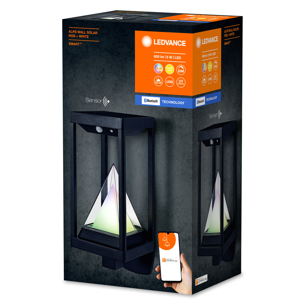 Outdoor Smart Solar Alps Wall sensor. Caratteristiche prodotto: Controllable via LEDVANCE SMART+ App (with minimum Android 8.0 or iOS 14.0). Apparecchi LED per esterni ad energia solare. Controllo dei colori RGB; circa 16 milioni di opzioni cromatiche disponibili. Dimmerabile. Temperatura di colore: 3.000 K (Warm White). Protocollo di rete: Bluetooth. Tipo di protezione: IP44. Ricarica della batteria tramite pannelli solari. Vantaggi prodotto: Installazione facile e veloce. Illuminazione colorata da giardino con opzioni di controllo smart e intelligente. Illuminazione a richiesta e risparmio energetico grazie al sensore di movimento e luce diurna. Utilizza una luce mullticolore e una luce bianca fredda o calda per molti scenari di illuminazione flessibili. Combina la funzionalità dell'illuminazione generale e dell'illuminazione d'ambiente. Materiali di elevata qualità. Aree applicative: Illuminazione generale. Per esterni (IP44). Giardini. Terrazze, balconi. Facciate di edifici. Apparecchiatura / Accessori: For control via LEDVANCE SMART+ App, a smartphone or tablet is required (with minimum Android 8.0 or iOS 14.0). Controllo via app o voce con sistemi Smart home compatibili. Viti e tasselli di montaggio inclusi. Alimentatore incluso.