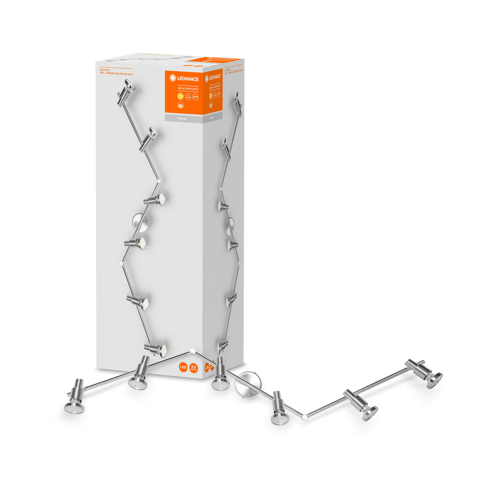 Apparecchi a plafone con faretti GU10. Caratteristiche prodotto: La famiglia degli apparecchi presenta 5 versioni con fino a 6 luci spot. Custodia in nichel satinato. Testa regolabile. Vantaggi prodotto: Risparmio energetico fino al 90% rispetto alle lampade alogene Spotlight. Design senza tempo. Flessibile grazie alle lampade LED sostituibili. Facile montaggio. Aree applicative: Applicazioni in interni. Corridoi, ingressi, scale, soggiorni, seminterrati. Cucine, spazi di lavoro. Montaggio a soffitto o a parete. Apparecchiatura / Accessori: Equipaggiato con la LAMPADA LED OSRAM EAN 4058075233263. Tutti gli accessori per il montaggio e la connessione inclusi.