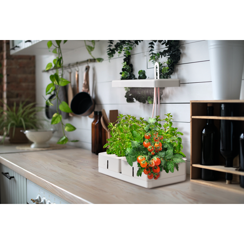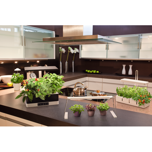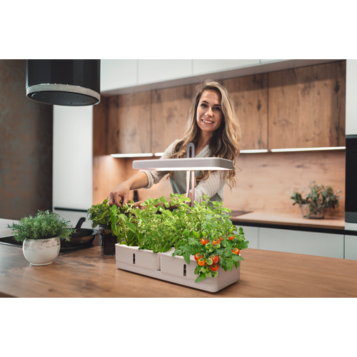 Apparecchio LED per floricoltura con due vani per la coltivazione. Caratteristiche prodotto: Utilizza una combinazione di LED bianchi a spettro completo e LED rossi. Altezza della testa della lampada regolabile in base all'altezza della pianta. Vantaggi prodotto: Lo spettro LED appositamente sviluppato promuove la fotosintesi nella maggior parte delle piante. Imita il ciclo giorno/notte grazie al funzionamento automatico del timer. Aree applicative: Giardinaggio al coperto. Cucine. Spazi abitabili. Apparecchiatura / Accessori: Comprese cassette di coltivazione con indicazione del livello dell'acqua.