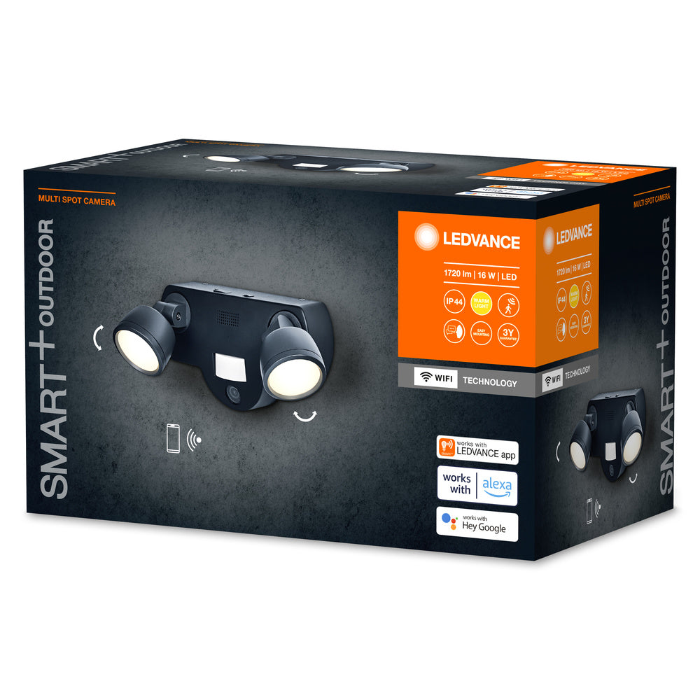 Outdoor Smart Camera Multispot. Caratteristiche prodotto: Controllable via LEDVANCE SMART+ App (with minimum Android 8.0 or iOS 14.0). Controllabile tramite controllo vocale disponibile: Google Assistant o Amazon Alexa. Altoparlante incorporato e sirena di allarme. Dimmerabile. Temperatura di colore: 3.000 K (Warm White). Protocollo di rete: WiFi. Tipo di protezione: IP44. Videocamera HD Live view. Testa regolabile. Vantaggi prodotto: Installazione facile e veloce. Maggiore percezione di sicurezza grazie all'elevata luminosità. The recorded data is saved on the unit's memory card or cloud storage. Materiali di elevata qualità. Aree applicative: Per esterni (IP44). Garage. Aree di ingresso. Apparecchiatura / Accessori: For control via LEDVANCE SMART+ App, a smartphone or tablet is required (with minimum Android 8.0 or iOS 14.0). Viti e tasselli di montaggio inclusi.