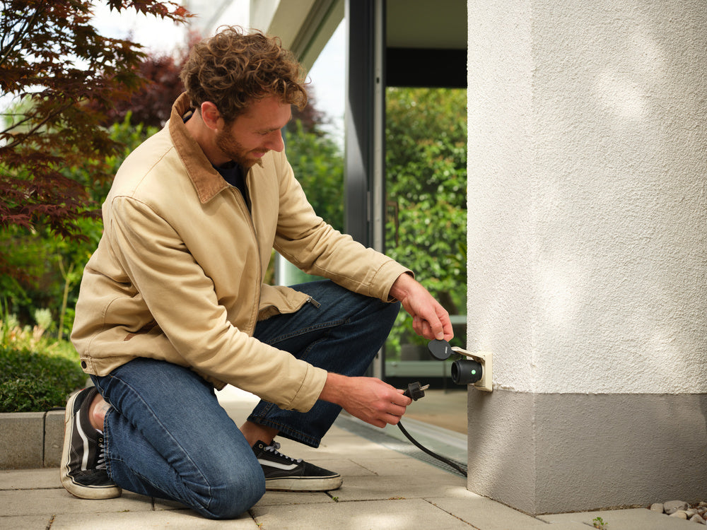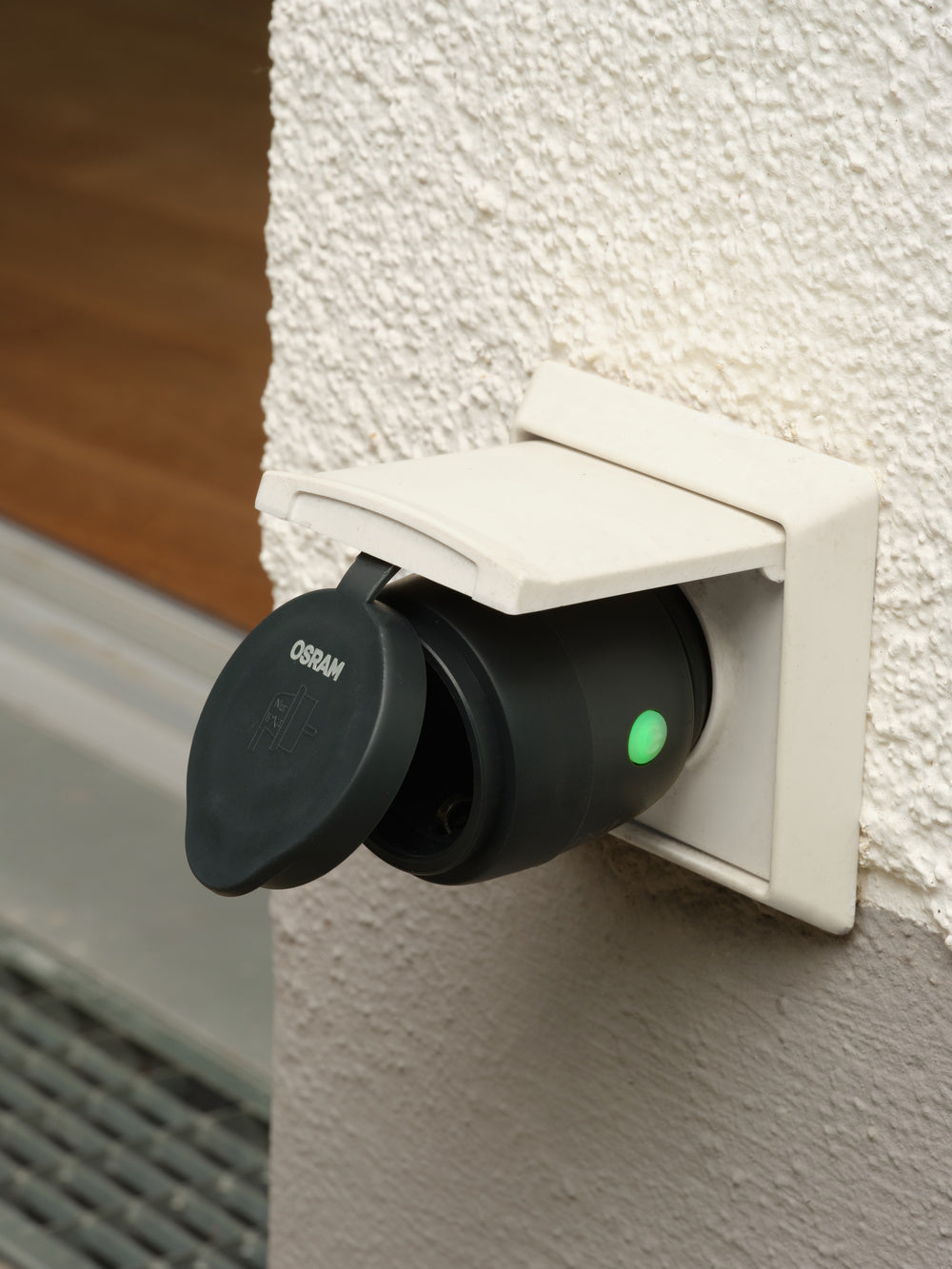 Kompakte smarte Außensteckdose mit Energieverbrauchskontrolle über ZigBee Technologie steuerbar.