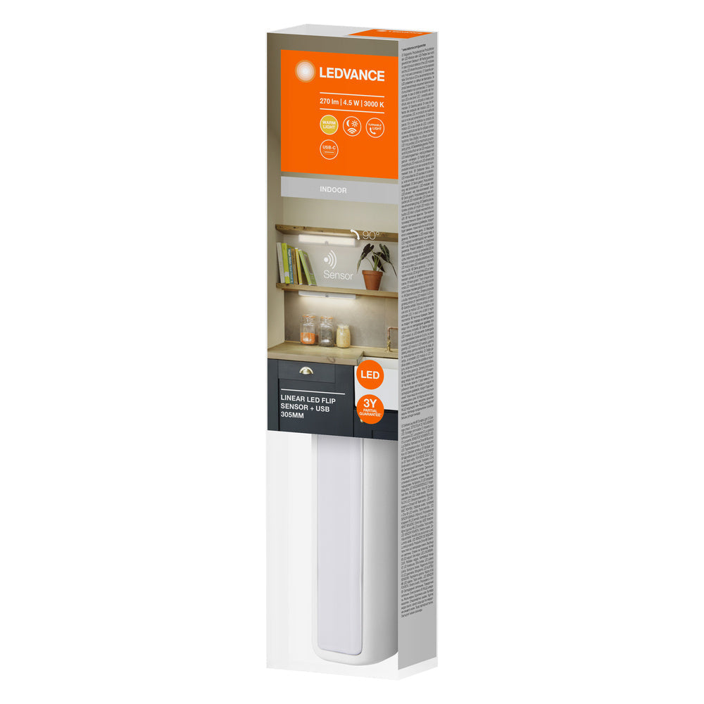 Undercabinet luminaire with 90° rotatable lamp body. Caratteristiche prodotto: Testa rotante di 90° per un utilizzo versatile. Sensore di movimento PIR e di luce diurna. Vantaggi prodotto: Adatto per il montaggio negli angoli, a parete o sotto i pensili. Facile montaggio. Aree applicative: Illuminazione di scaffali e sottopensili. Apparecchiatura / Accessori: Cavo USB, lunghezza: 1m. 3 vani batteria AA (batterie non incluse).