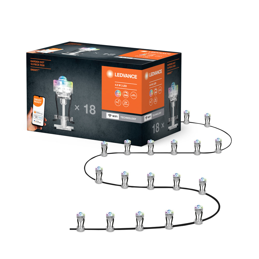 Spot decorativi per uso esterno con tecnologia WiFi. Caratteristiche prodotto: Controllable via LEDVANCE SMART+ App (with minimum Android 8.0 or iOS 14.0). Controllabile tramite controllo vocale disponibile: Google Assistant o Amazon Alexa. Controllo dei colori RGB; circa 16 milioni di opzioni cromatiche disponibili. Dimmerabile. Classe di protezione (punti): IP65. Classe di protezione (alimentazione): IP44. Vantaggi prodotto: Installazione facile e veloce. Illuminazione colorata da giardino con opzioni di controllo smart e intelligente. Aree applicative: Giardini, terrazze e altre aree all'aperto. Apparecchiatura / Accessori: Alimentatore incluso solo nel kit base. Controllo via app o voce con sistemi Smart home compatibili. For control via LEDVANCE SMART+ App, a smartphone or tablet is required (with minimum Android 8.0 or iOS 14.0).