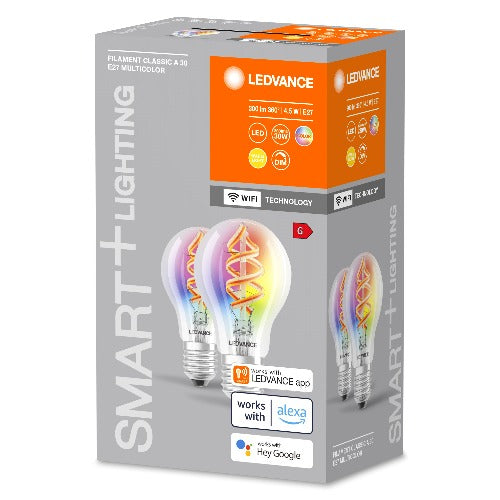 Lampada con forma classica a goccia e design a filamento con tecnologia WiFi. Caratteristiche prodotto: Controllable via LEDVANCE SMART+ App (with minimum Android™️ 8.0 or iOS 14.0). Controllabile tramite Google Assistant e Amazon Alexa. Protocollo di rete: WiFi. Dimmerabile. Durata: fino a 15.000 ore. Colore della luce: bianco caldo (2.700 K). Vantaggi prodotto: Controllo wireless tramite App. Facile da installare e utilizzare. Non contiene mercurio. Aree applicative: Illuminazione generale. Interni residenziali. Ambito professionale (hotel, bar, boutiques ecc). Outdoor use in suitable outdoor luminaires only. Apparecchiatura / Accessori: For control via LEDVANCE SMART+ App, a smartphone or tablet is required (with minimum Android 8.0 or iOS 14.0).