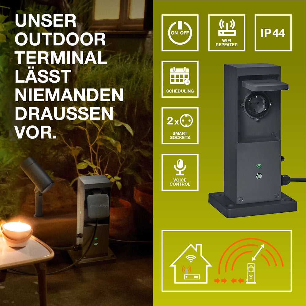Outdoor Terminal with integrated WiFi Repeater and two Smart Sockets. Caratteristiche prodotto: Controllable via LEDVANCE SMART+ App (with minimum Android 8.0 or iOS 14.0). Controllo vocale disponibile: Google Assistant e Amazon Alexa. Due prese standard intelligenti possono essere controllate individualmente. Elevato potere di interruzione: fino a 3680 W/16 A. Protocollo di rete: WiFi (2,4 GHz). Tipo di protezione: IP44. Pianificazione. Vantaggi prodotto: Il ripetitore WiFi integrato estende la zona WLAN fino a 45 metri all'aperto. WiFi Repeater consente l'associazione di altri dispositivi wireless alla WLAN fino a 15 dispositivi. Elevato standard di sicurezza: protezione da sovraccarico, protezione da sovratensioni. Integra le attrezzature elettriche convenzionali nei sistemi compatibili di Smart Home. Consente la commutazione remota di sorgenti luminose convenzionali e altri dispositivi elettrici. Aree applicative: Ovunque i device non smart devono essere integrati in sistemi Smart Home compatibili. Giardini, terrazze e altre aree all'aperto. Apparecchiatura / Accessori: For control via LEDVANCE SMART+ App, a smartphone or tablet is required (with minimum Android 8.0 or iOS 14.0). Chiodi per il terreno per un fissaggio più semplice nei giardini. Cavo di alimentazione da 3 metri per un'installazione flessibile. Connettore del cavo incluso se il cavo di alimentazione deve essere prolungato.