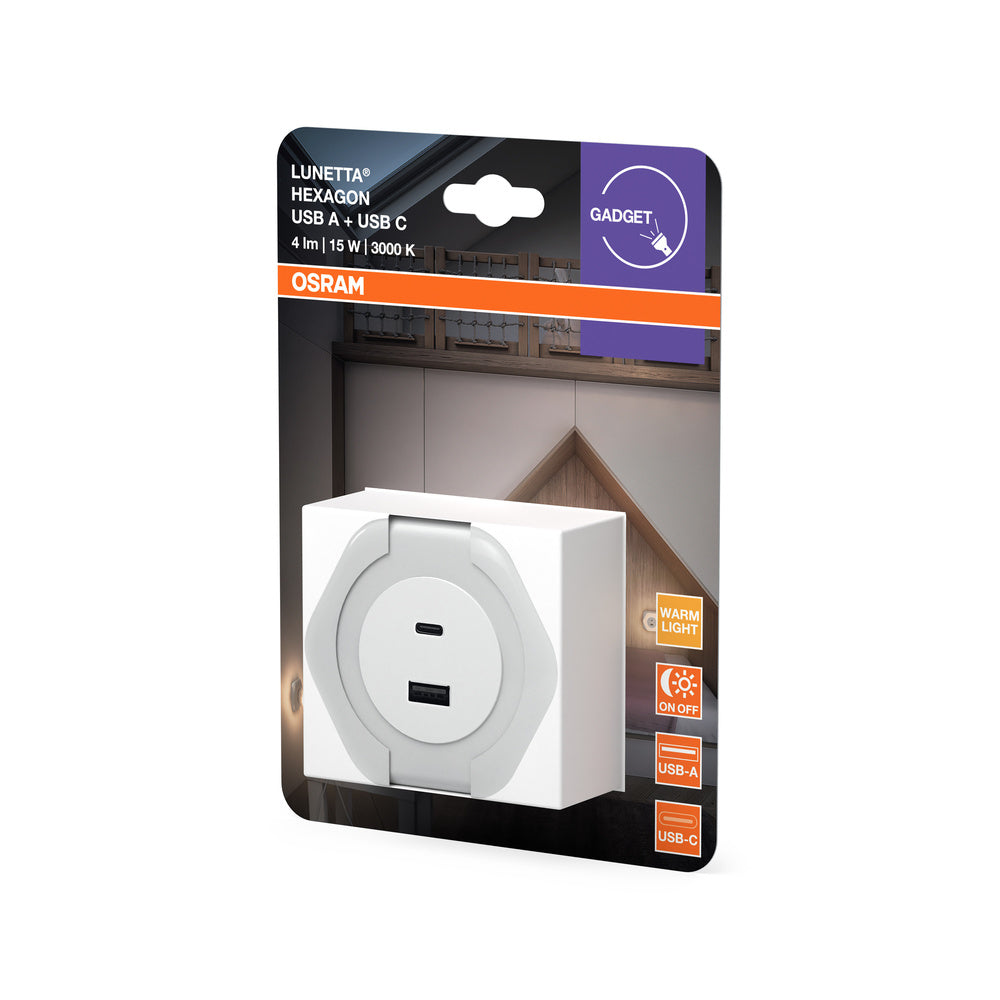 Luce notturna con presa con connessione USB A e C e sensore di luce diurna. Caratteristiche del prodotto: connessione USB A e C con funzione di ricarica. Colore della luce: bianco caldo. Tensione di alimentazione: 220…240 V. Sensore giorno/notte integrato. Vantaggi del prodotto: plug-and-play con spina EU. Efficiente dal punto di vista energetico grazie alla tecnologia LED. Design caratteristico ed elegante. Campi di applicazione: camere da letto. Camere da letto per bambini. Corridoi, scale. Luce notturna. Solo per illuminazione interna.
