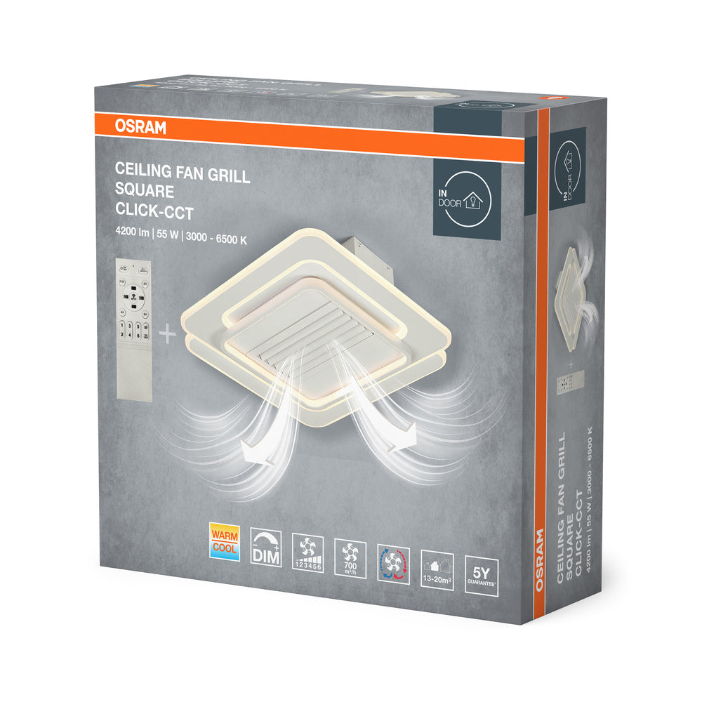 Ventilatore a soffitto LED con griglia, che combina luce e ventilazione.